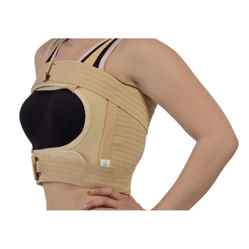 Бандаж м’яко та надійно підтримує грудну клітку в післяопераційному періоді. Фіксувальні стрічки на липучках дозволяють точно прилаштувати виріб до параметрів фігури пацієнтки. Анатомічна форма робить бандаж надзвичайно зручним і комфортним. Користувач не потребує сторонньої допомоги для надягання виробу. Модель розроблена для жіночої анатомії.