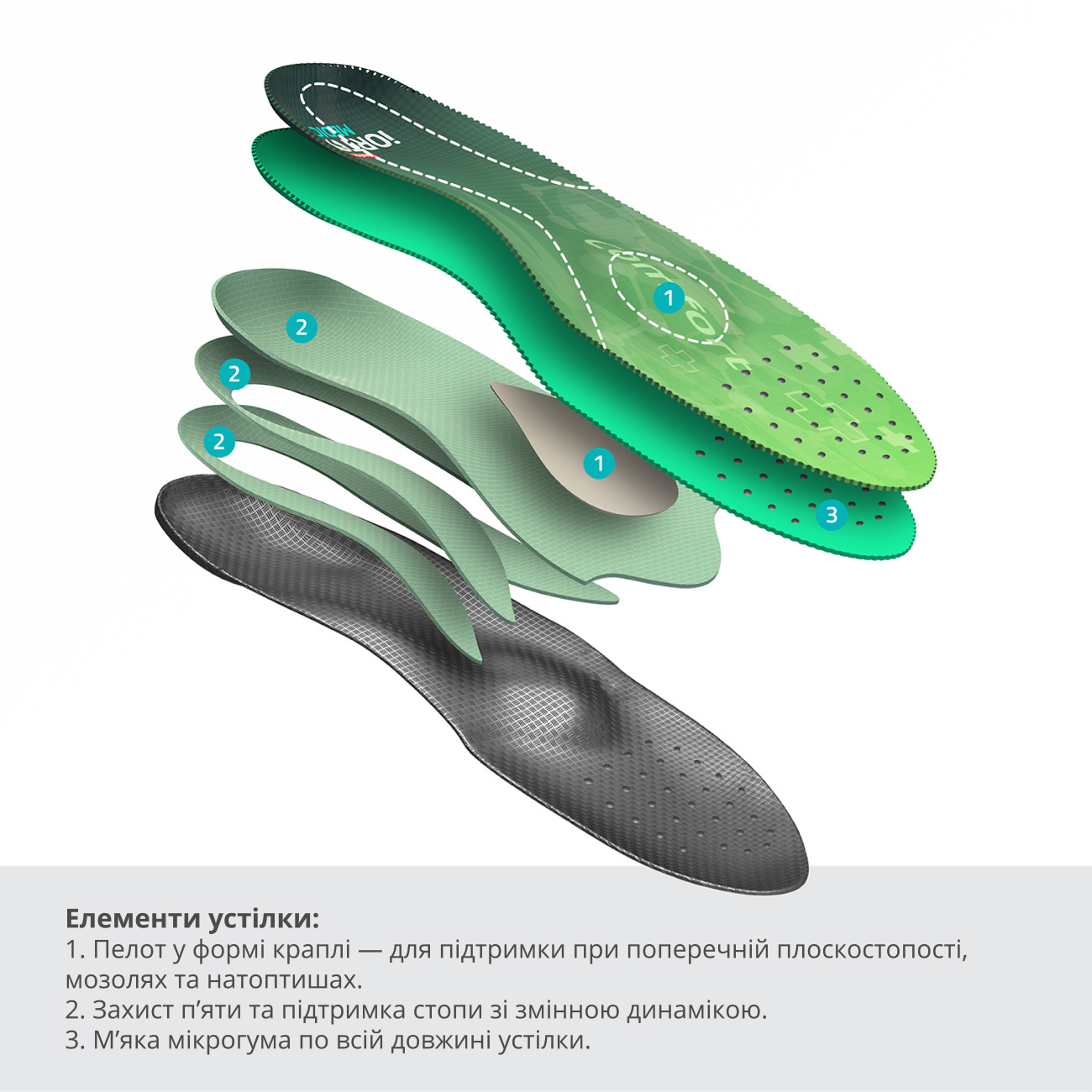 Стельки с изменяющейся динамикой iORTO MEDIC Comfort разработаны для людей с дискомфортом, болью, быстрой утомляемостью в стопах, суставах ног и спине. Благодаря особой многослойной структуре стельки защищают ноги от перегрузок и во время длительного стояния (как у продавцов-консультантов, учителей, фармацевтов и т.п.), так и при активных физических нагрузках (например, во время экскурсий, занятий спортом, походов). Анатомическое исполнение стельки позволяет мягко, но уверенно поддерживать своды стопы, а особый рельеф и конструктивные элементы стимулируют разные зоны стопы, заставляя мышцы работать и таким образом способствуя корректировке плоскостопия. Такая динамическая поддержка сохраняет естественную функциональность стопы и уменьшает риск травмы, усиливая контролируемость шагов во время хождения.