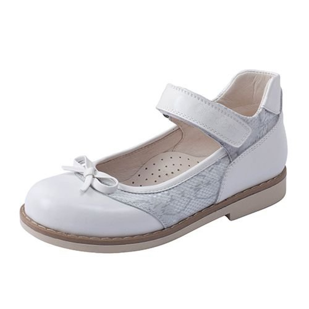 Стоит отметить, что первые позитивные результаты, вы сможете заметить буквально сразу: ребенок начнет не только меньше уставать от бега и ходьбы, но и значительно ровнее ставить ножки. Внутри туфель используется специализированная стелька повышенной жесткости, именно она обеспечивает стопе правильное положение и нейтрализует заваливание ножки ребенка. Специальная конструкция туфель позволяет носить их в теплую погоду: натуральная кожа не парит ногу и помогает поддерживать правильный термический баланс. Туфли представлены в праздничном светлом оттенке и прекрасно сочетают в себе два типа кожи: верхняя часть выполнена из белого питона, а периметр – из гладкой белой кожи. Благодаря повышенной комфортности и прочности изделия, туфли можно смело использовать для повседневного ношения.
