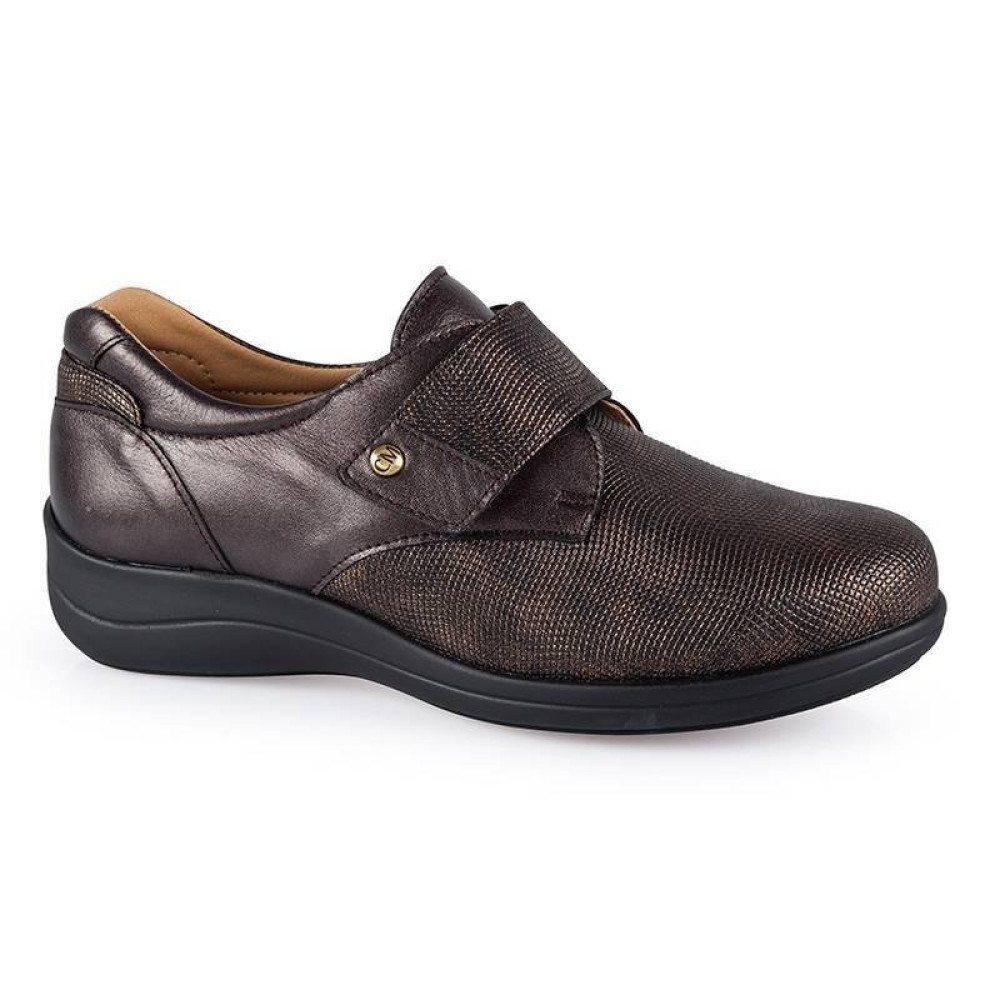 Ортопедичні туфлі CALZAMEDI Stretch для жінок виготовлені з урахуванням анатомії, фізіології та правильної біомеханіки стопи під час руху або у тривалому перебуванні в положенні стоячи. Підошва правильної форми забезпечує рівномірний розподіл навантаження на стопу та правильний перекат стопи під час крокування. Передня частина туфель еластична, тому це взуття підходить для жінок, у яких набрякають ноги під вечір і звичайне взуття стає затісним.